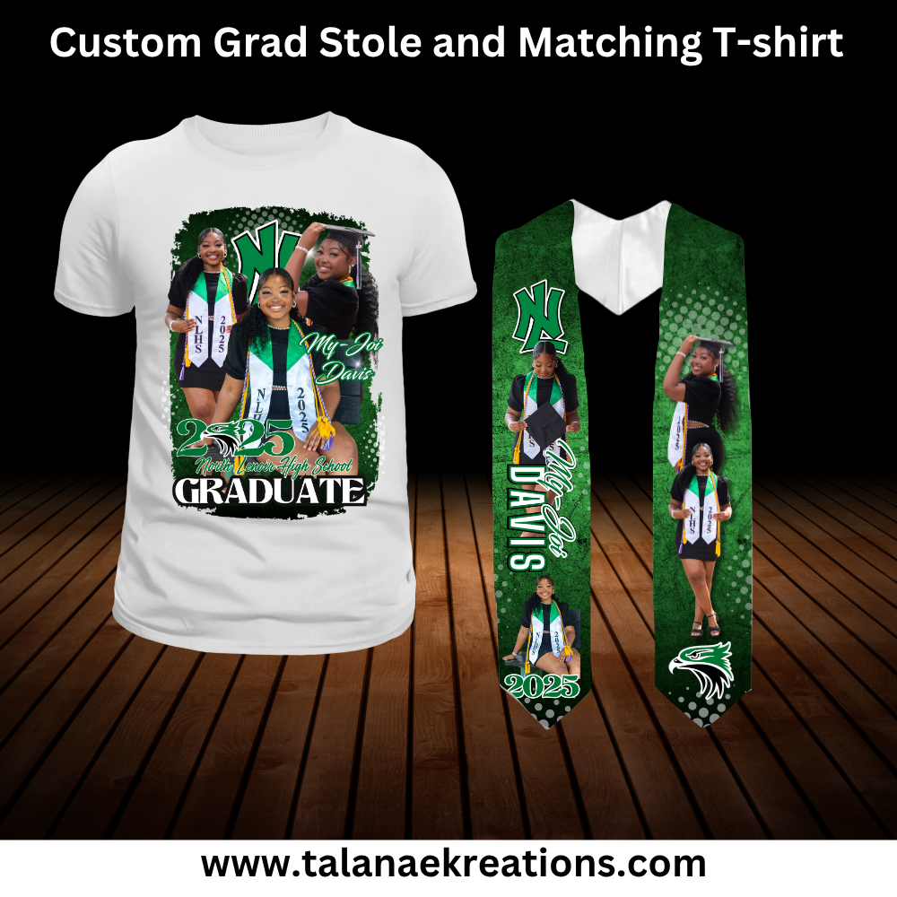 Stand out at graduation with our Custom Grad Stole and Matching T-Shirt! Made with high-quality materials, our customizable stole and t-shirt will provide a unique and personal touch to your special day. Show off your school colors and make a statement with our custom bundle.